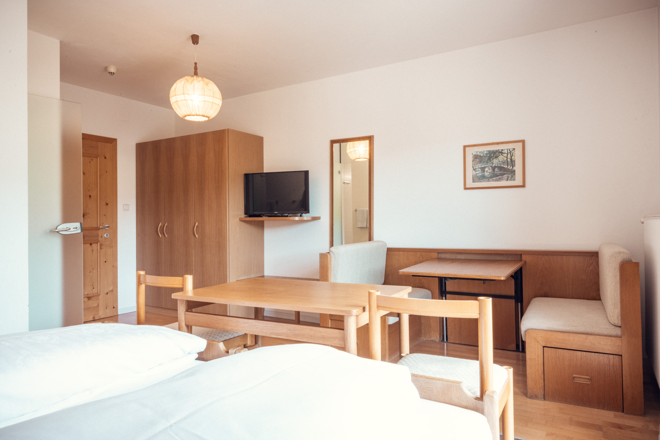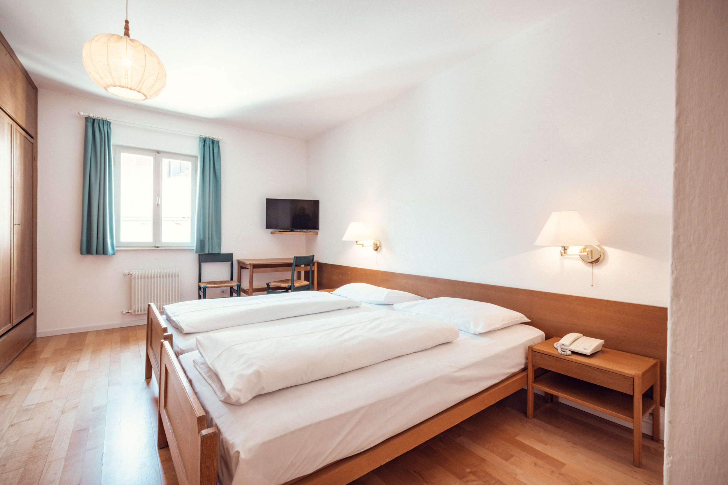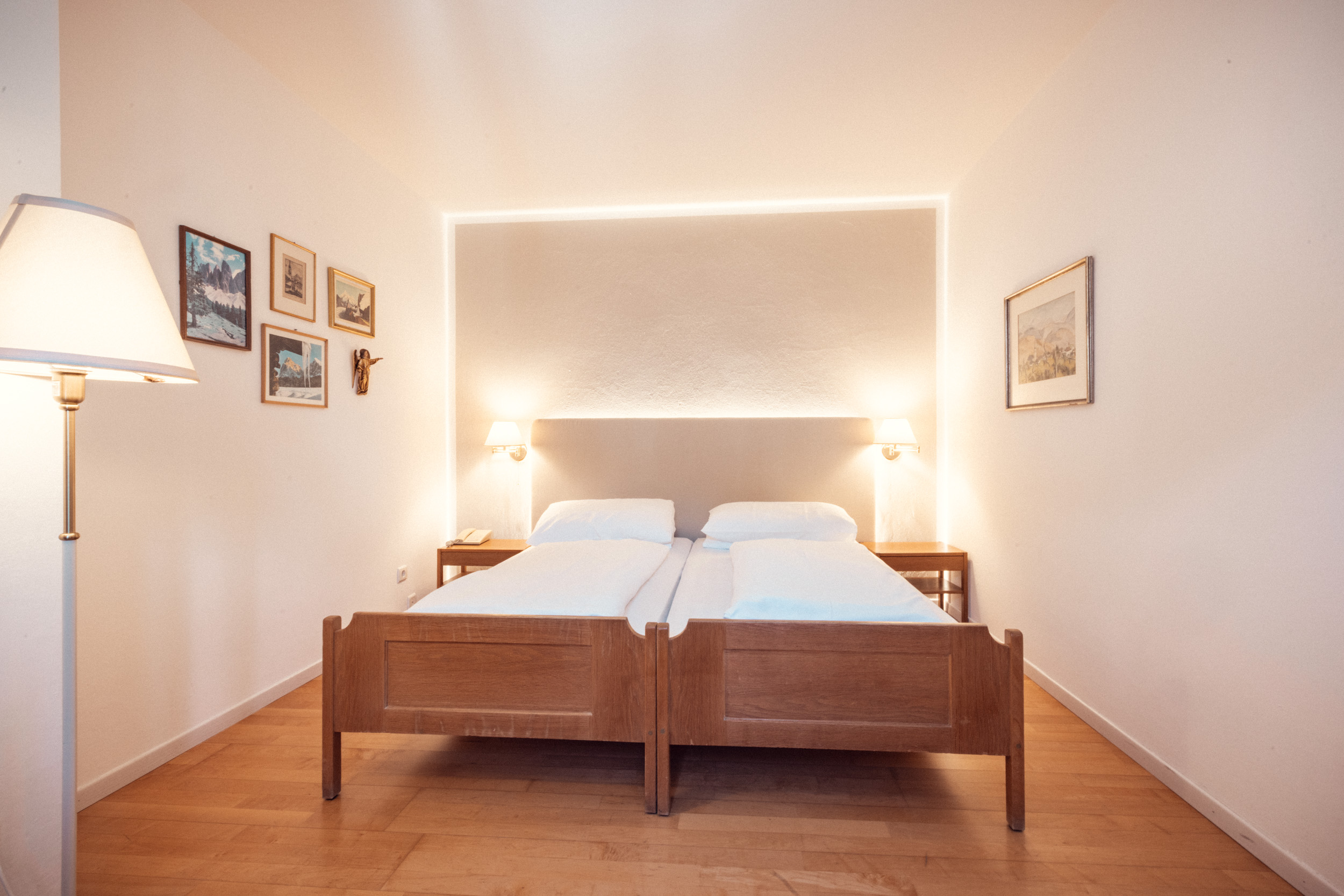 Le nostre camere sono arredate in modo semplice e funzionale. Le camere doppie standard di tipo B sono ideali per escursionisti o soggiorni brevi. Godetevi la tranquillità e lasciate che lo sguardo si perda sulla vista del pittoresco paese o delle maestose montagne.